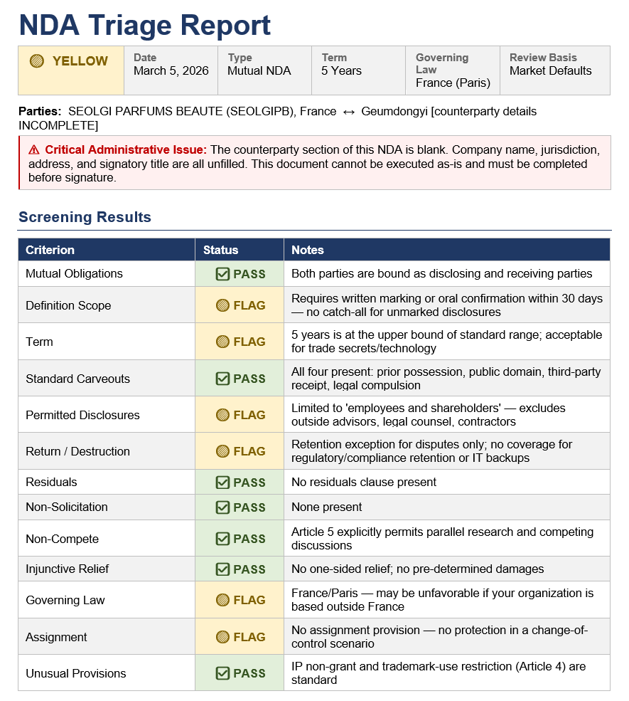 - ๋ฐ๋ณต์ ์ผ๋ก ๋ค์ด์ค๋ ํ์ค NDA๋ฅผ ๊ฑฐ๋ฅผ ๋: ๋น์ทํ ์กฐ๊ฑด์ NDA๊ฐ ์ฌ๋ฌ ๊ฑด ๋ค์ด์จ๋ค๋ฉด, AI๋ก ์ฌ์ ์ฌ์ฌํด์ '๋ฐ๋ก ์ฒ๋ฆฌ ๊ฐ๋ฅํ ๊ฑด'๊ณผ '๋ฒ๋ฌด ๊ฒํ ๊ฐ ํ์ํ ๊ฑด'์ ๋ถ๋ฅํ๋ ์ํฌํ๋ก์ฐ๋ฅผ ๋ง๋ค ์ ์์ด์.
