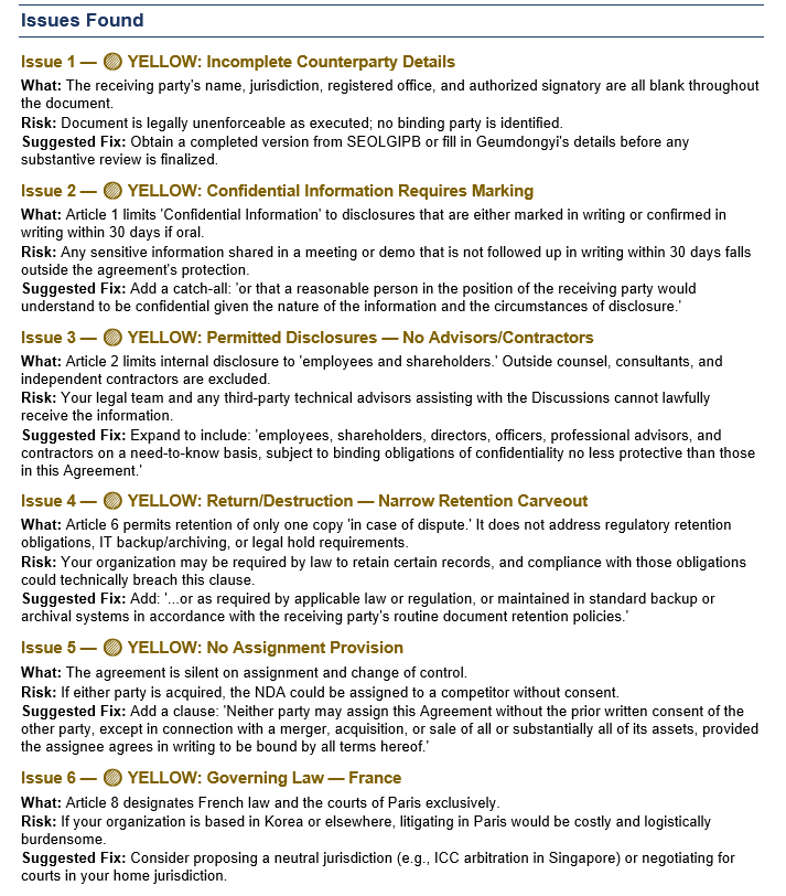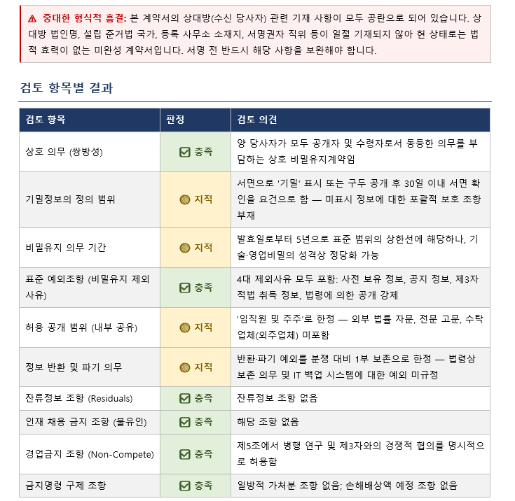 - NDA๋ ์ฐ๋ฆฌ๊ฐ ์ ๋ณด๋ฅผ ์ ๊ณตํ๋ ์ชฝ์ธ์ง, ์๋ นํ๋ ์ชฝ์ธ์ง์ ๋ฐ๋ผ ๊ฒํ ํฌ์ธํธ๊ฐ ์์ ํ ๋ฌ๋ผ์ ธ์. ๊ฐ์ฅ ๋จผ์ ํ์ธํด์ผ ํ ๊ธฐ๋ณธ ์ ์ ์ธ๋ฐ, ํด๋ก๋๋ ์ด ๋งฅ๋ฝ ์์ด ์ผ๋ฐ๋ก ์ ์ธ ๊ฒฐ๊ณผ๋ง ๋ด๋จ์ด์. ๋ฌผ๋ก , ํ๋ ์ด๋ถ์ ์ด ์ ๋ณด๊ฐ ๋ด๊ฒจ ์์๋ค๋ฉด, ๋ง์ถคํ ์๊ฒฌ์ ๋ด๋์์ ๊ฒ๋๋ค.