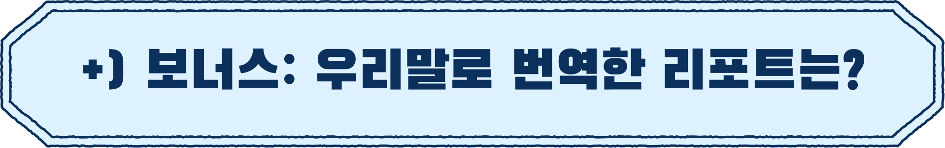 ๐ฌ: "์ฌํค, ๊ทธ๋ฐ๋ฐ ๋์ฒ๋ผ ์์ด๊ฐ ๋ถํธํ ์ฌ๋๋ ๋ง์์. ๊ทธ๋์ ์ด ๋ฆฌํฌํธ๋ฅผ ํ๊ตญ์ด๋ก๋ ๋ฒ์ญํด๋ดค์ด." ๐ฆ: "ํ ..." ๐ฌ: "์, ๋ณ๋ก์ผ?" ๐ฆ: "๋ฒ์ญ ํ๋ฆฌํฐ๊ฐ ์ข ์์ฌ์." |