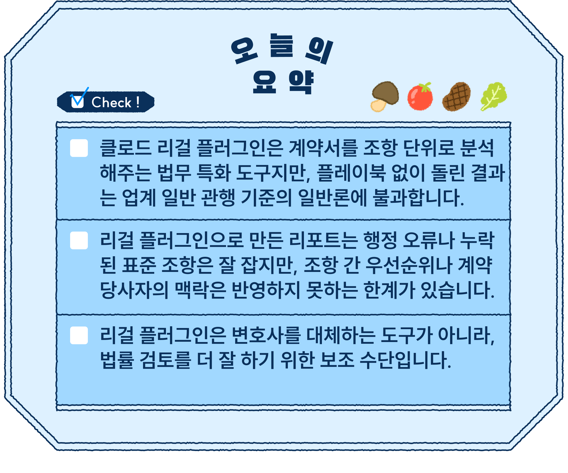 ์ ๋ณํธ์ฌ ํ์ธ์ ์๋ตํ ์ ์์ด์: AI ๋ฆฌํฌํธ๋ ๊ณ์ฝ ๋ถ์์ด ์๊ฒผ์ ๋ ๋ฒ์ ๊ทผ๊ฑฐ๋ก ์ ์ถํ ์ ์์ด์. "AI๊ฐ ๊ด์ฐฎ๋ค๊ณ ํ๋ค"๋ ๋ง์ ๋ฒ์ ์์ ์๋ฌด๋ฐ ํจ๋ ฅ์ด ์์ต๋๋ค. ๊ณ์ฝ ์ข